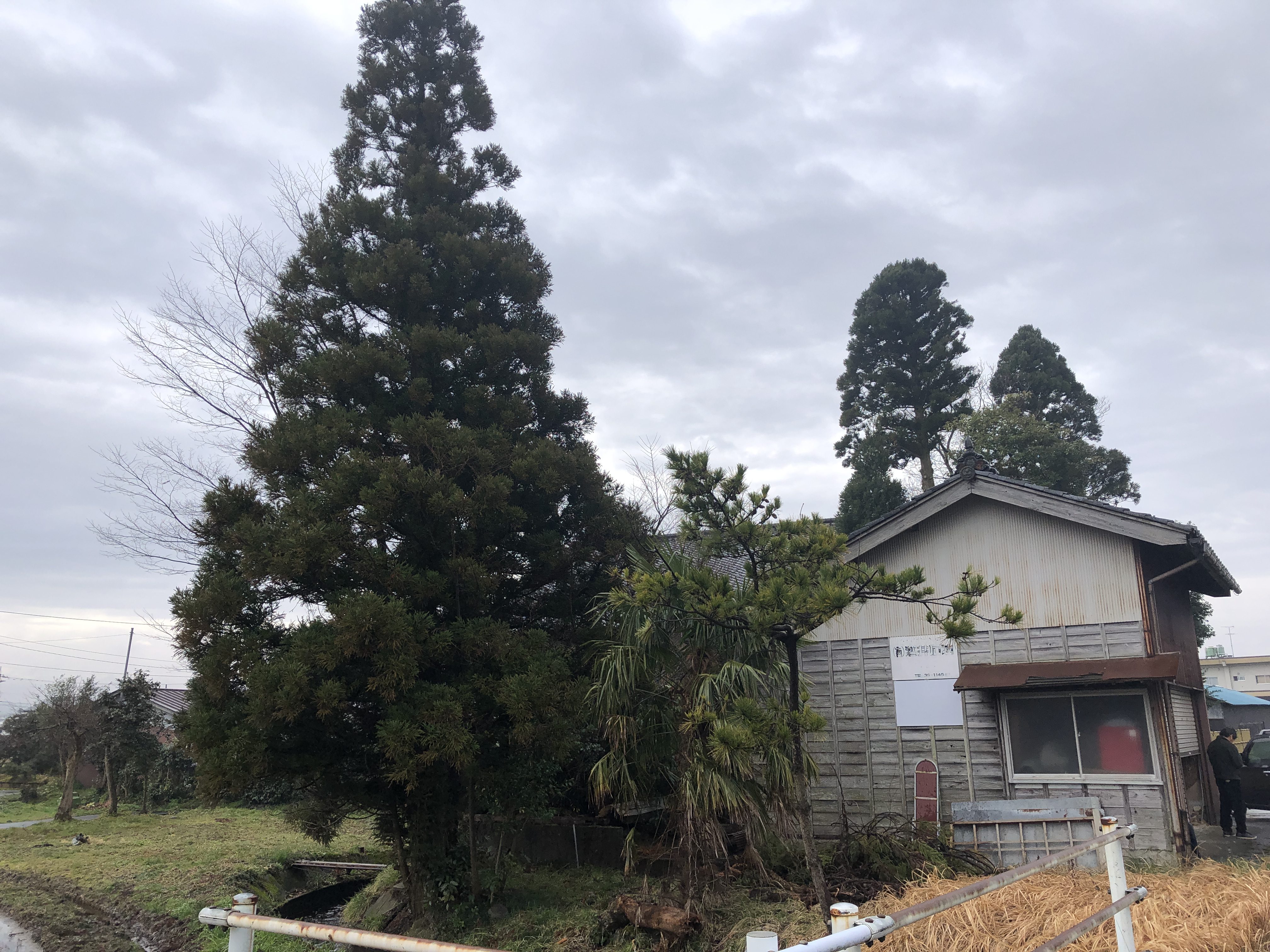 納屋の後ろの木が大きくなりすぎて伐採したい。とのご依頼。