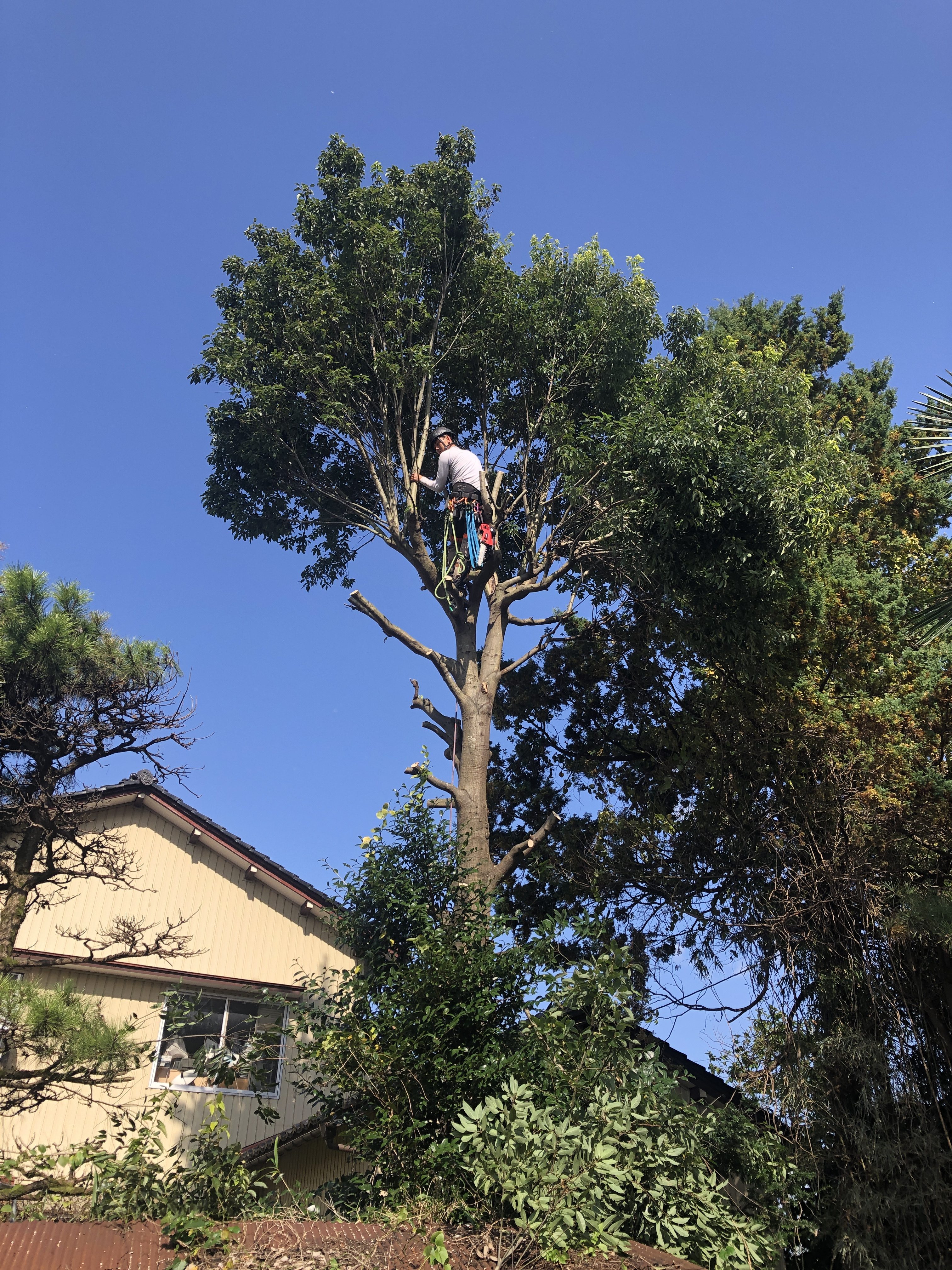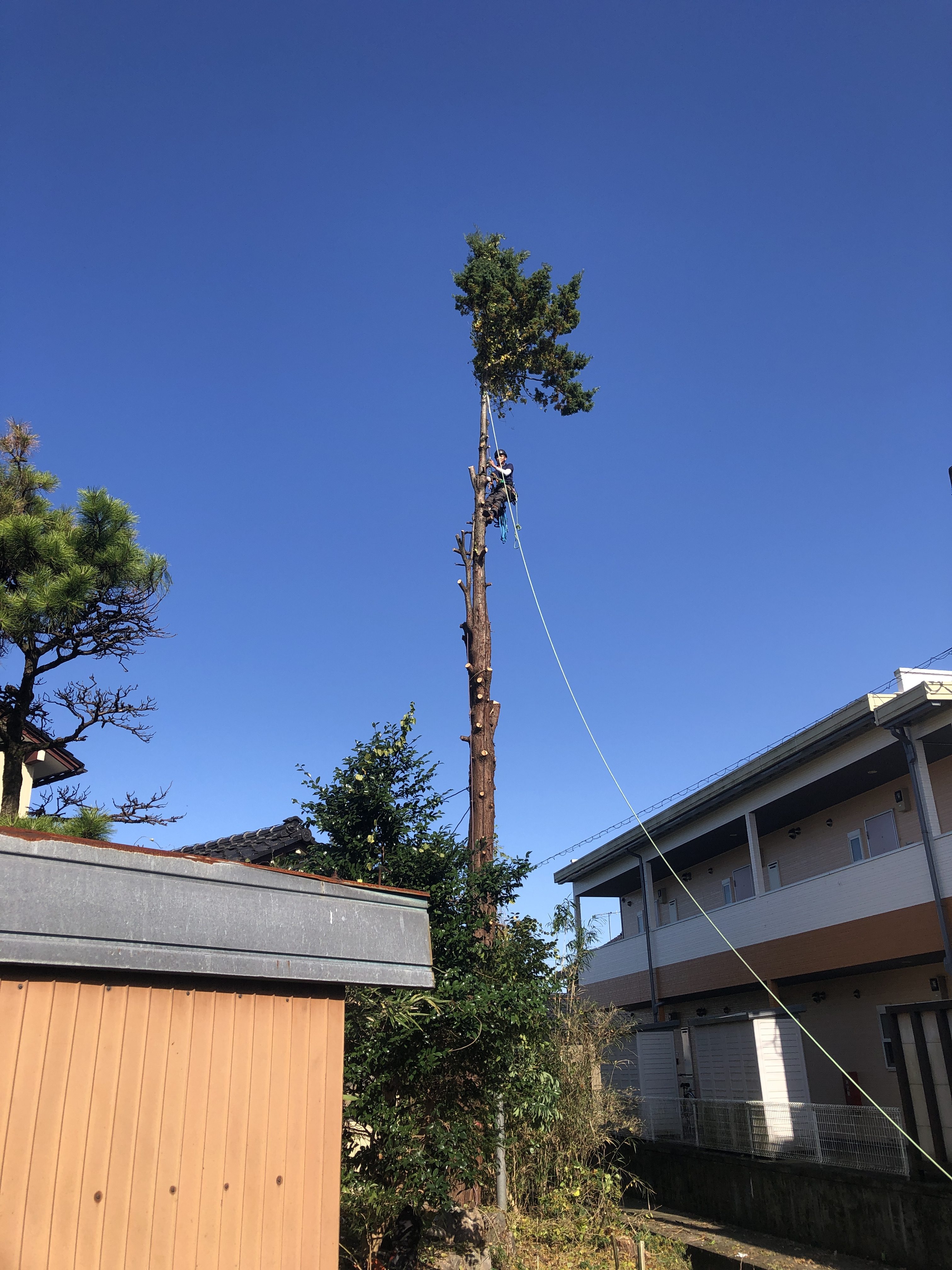 レッカーでの作業も考えましたが、費用のこともあり高所作業員による特殊伐採です。