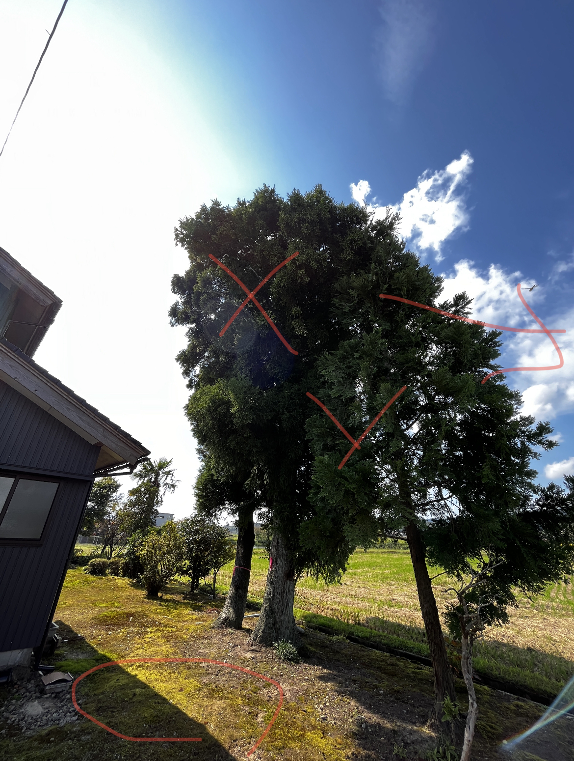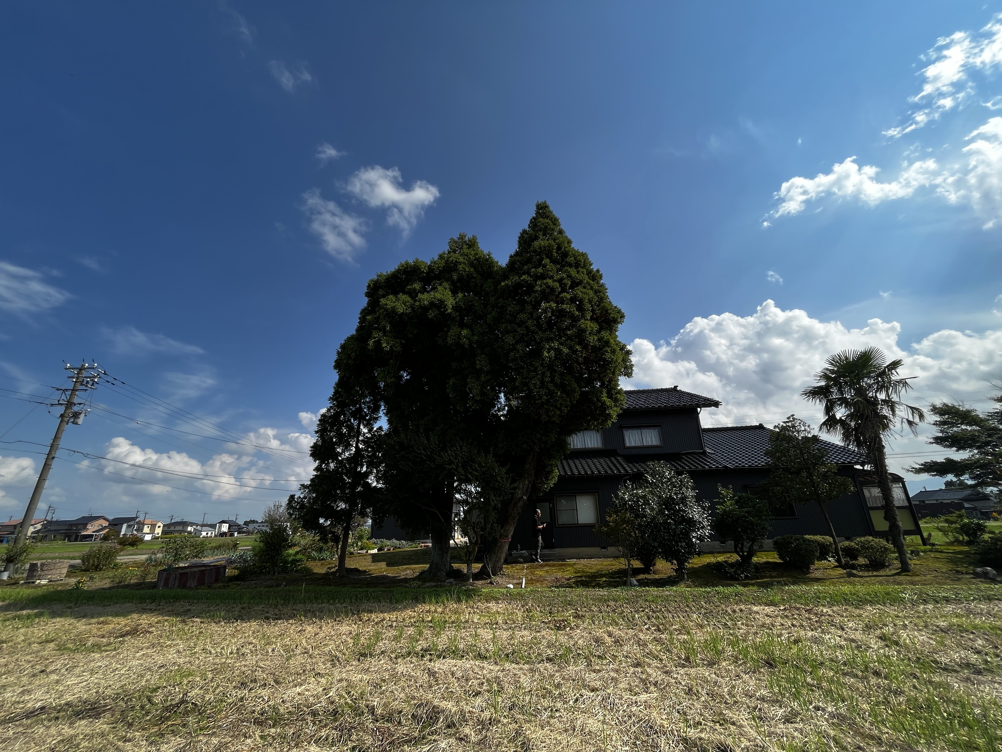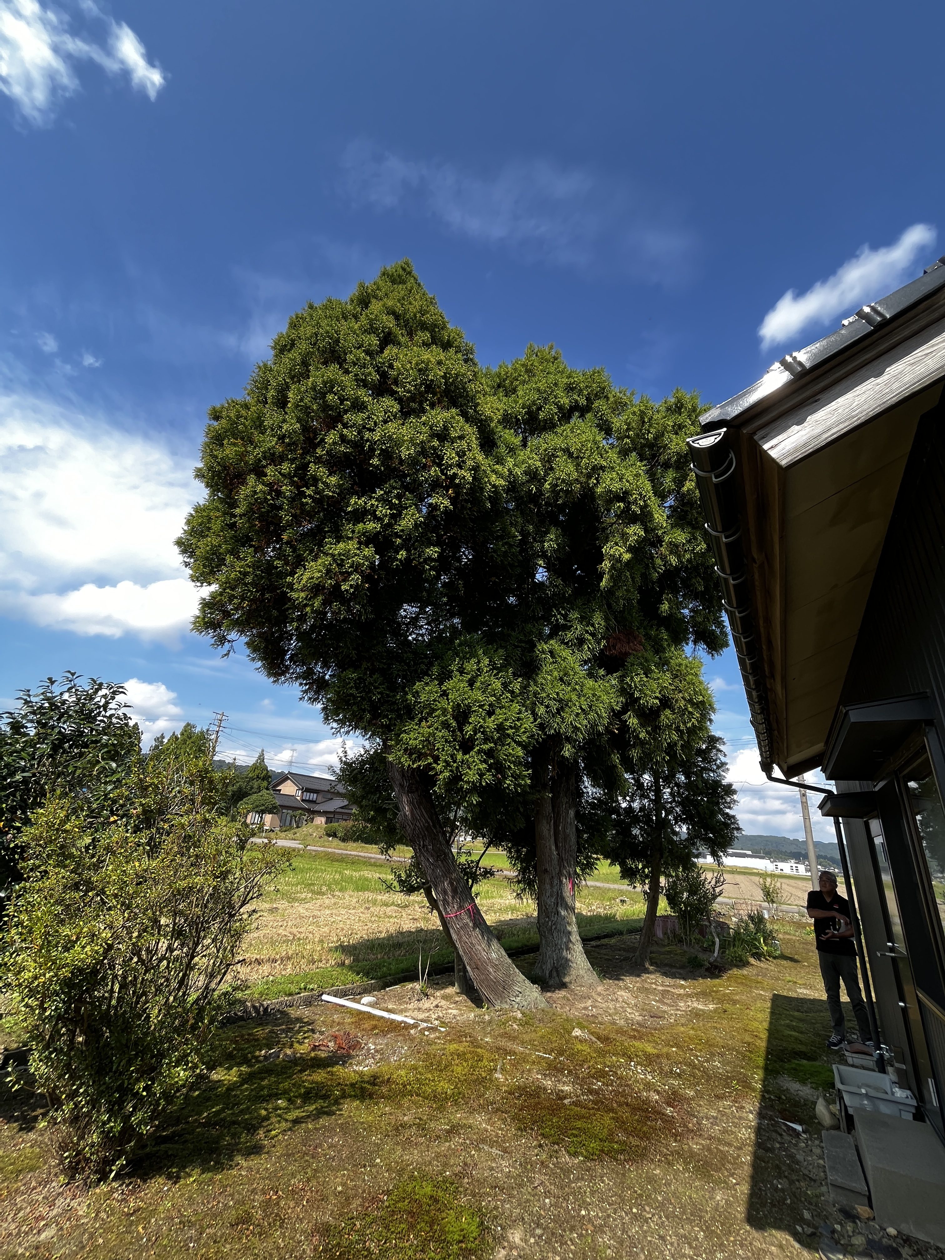 これまで強風からお屋敷を守ってきた杉ですが、大きく傾いてきているのでこの度伐採となりました。