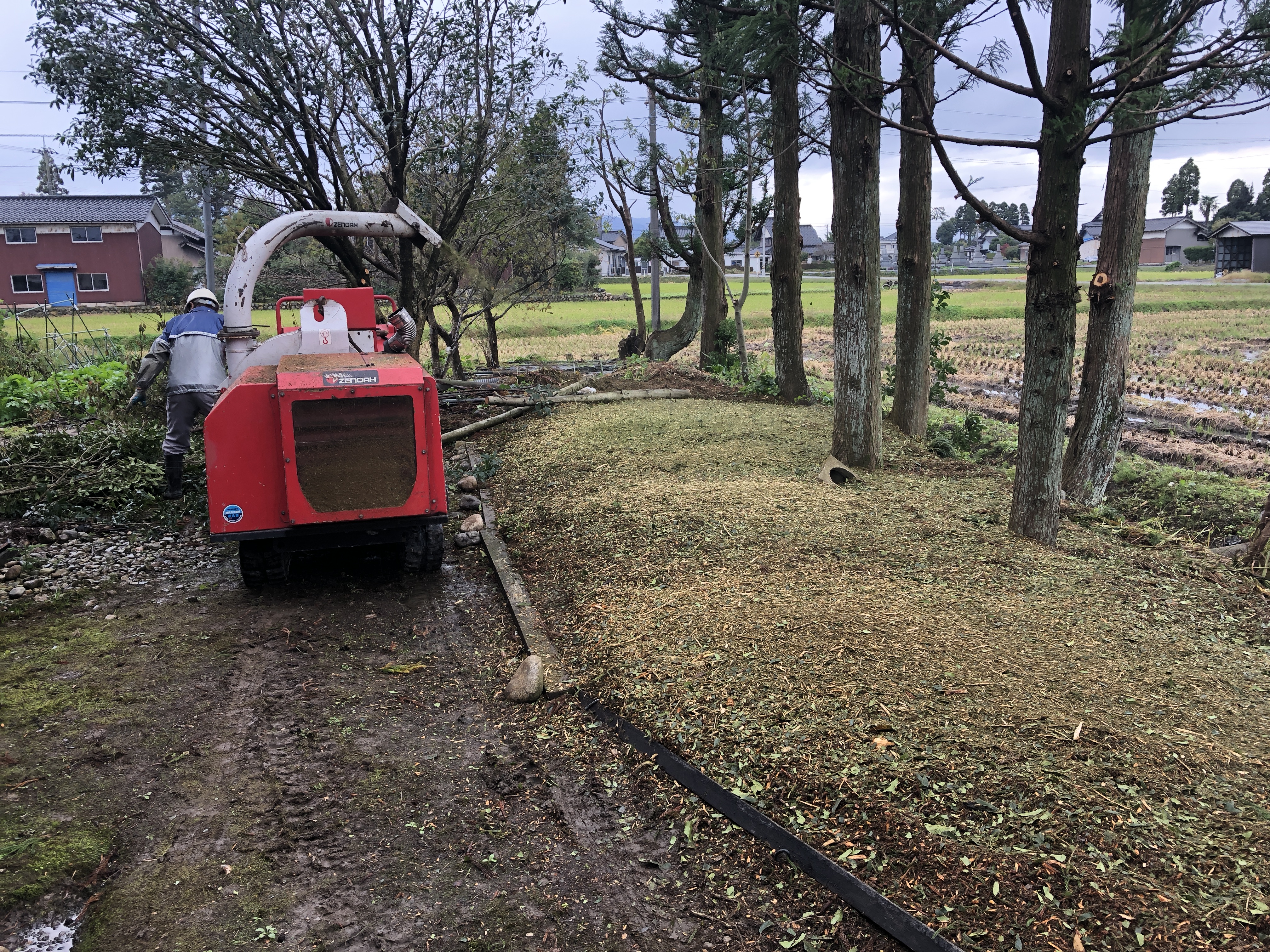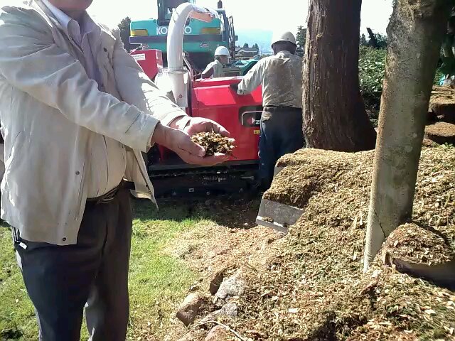 チッパーシュレッダーと呼ばれる機械によるチップ処理をお勧めしております。