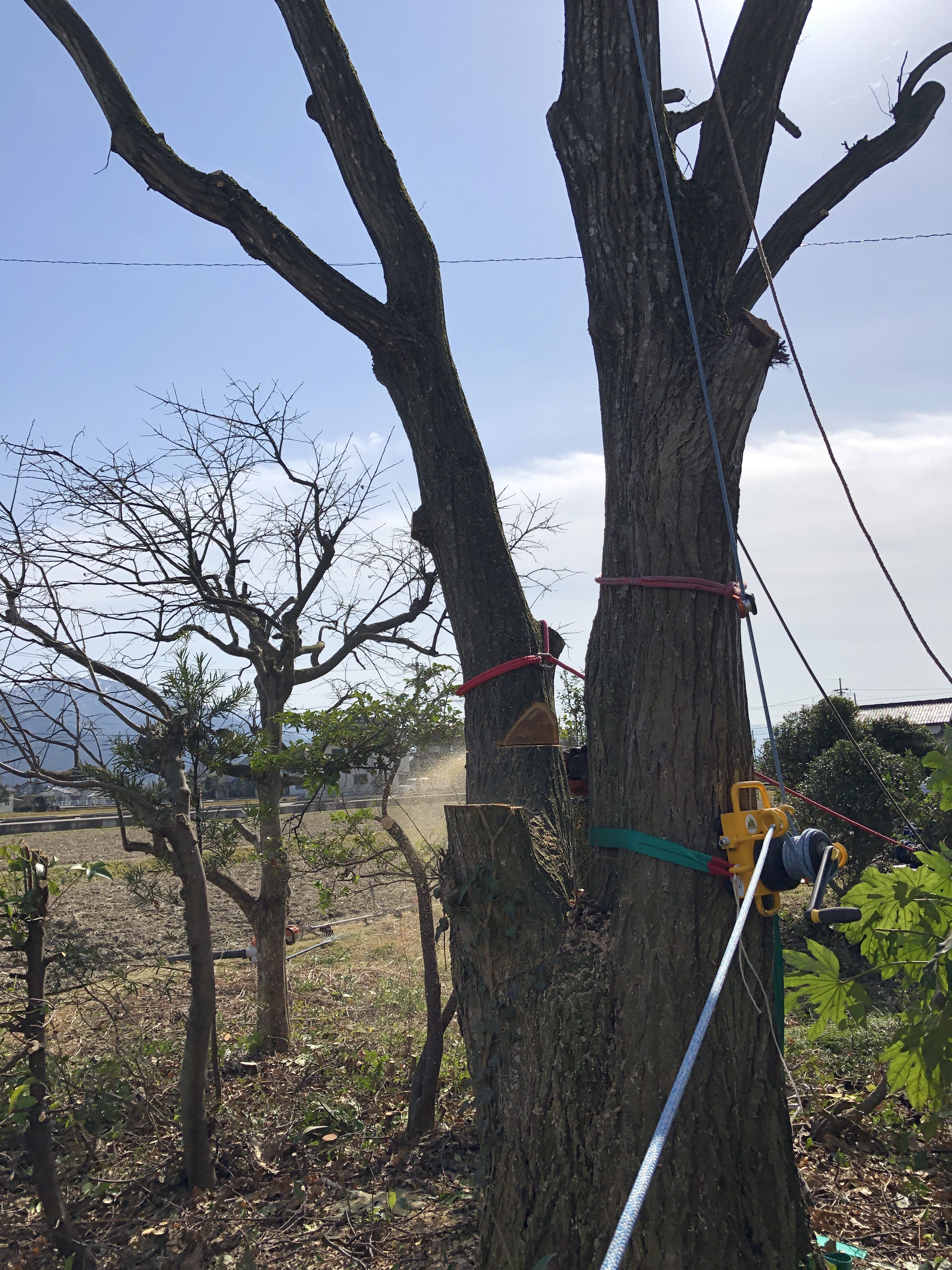 特殊高所作業員によるロープワークにて吊りおろしながらの伐採を行いました。
