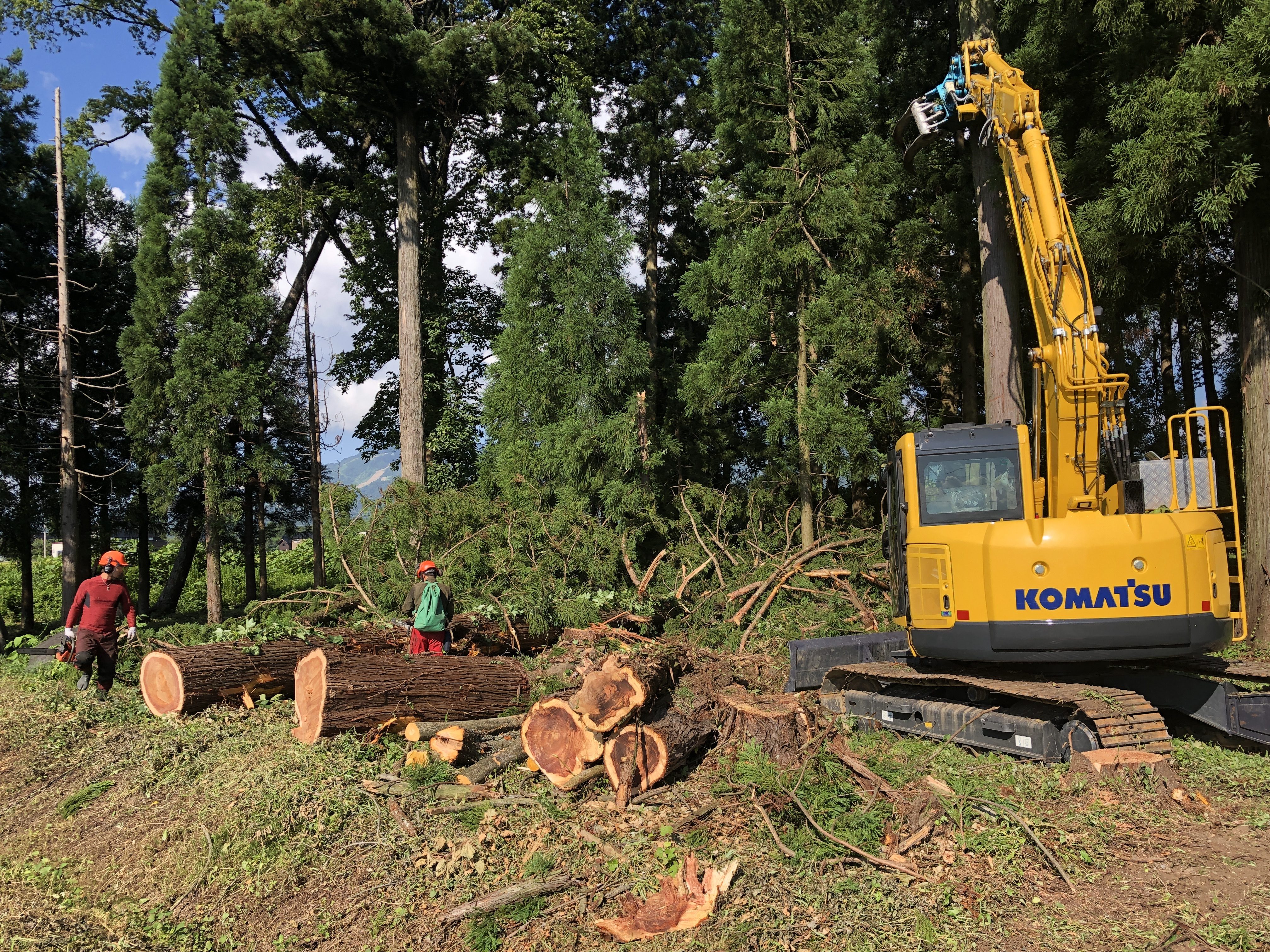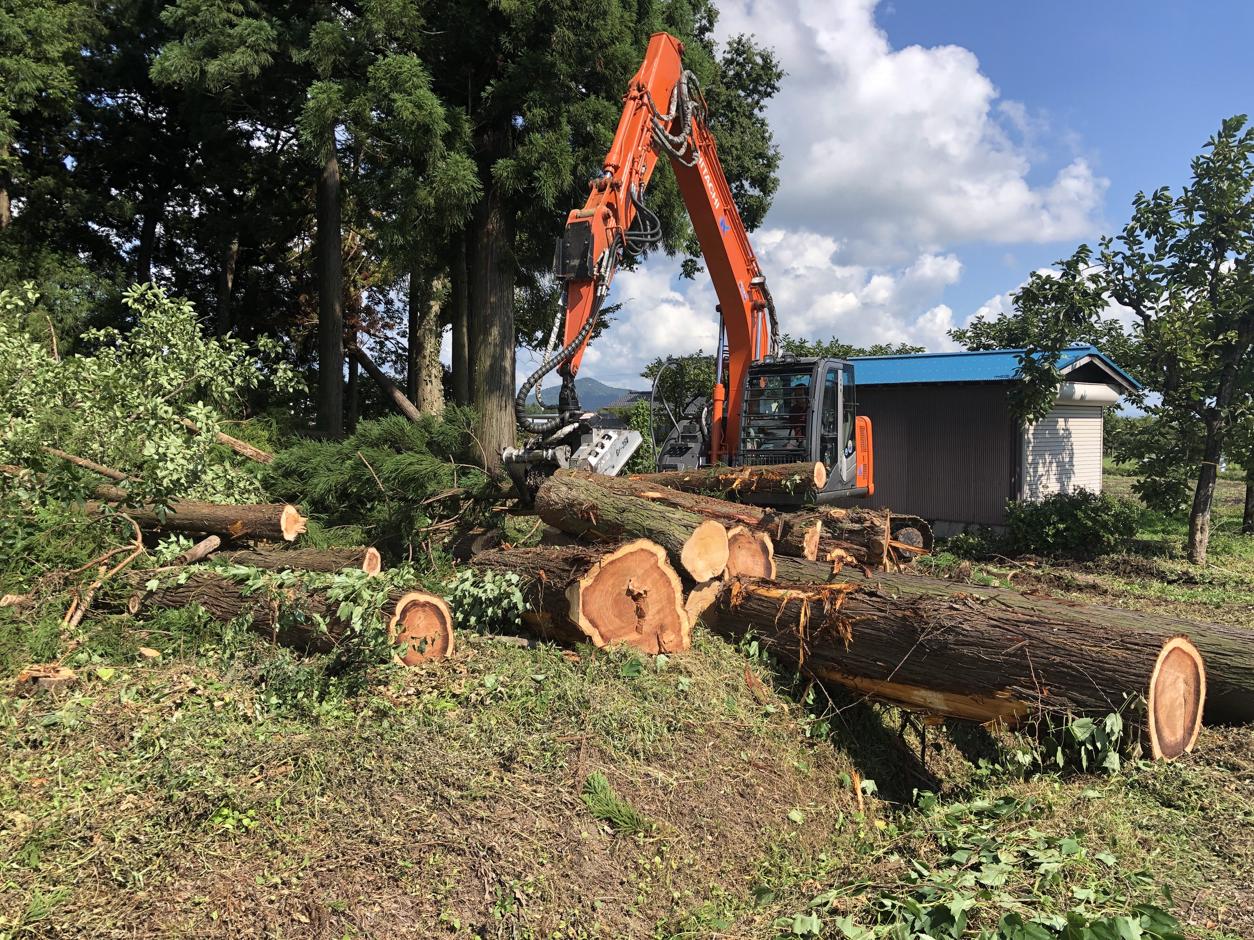 伐採、枝葉チップ処理、丸太搬出、抜根、整地まで行いました。